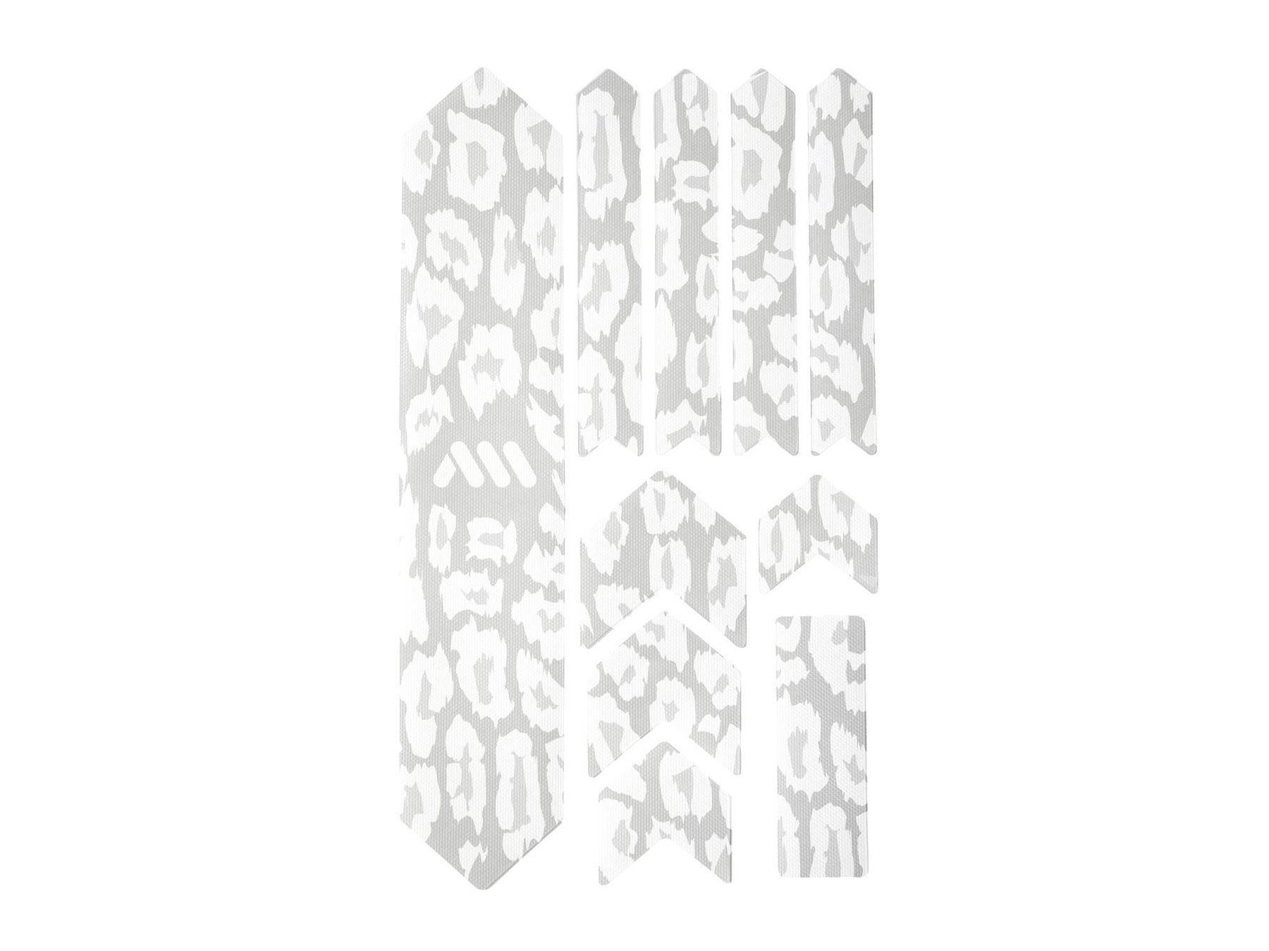 10 parts for a universal protection system: 1 big part for the down tube; 4 arrow parts for extending the down tube protection or top tube, 4 parts for the chainstay; 1 rectangle for cable wear protection or other uses.